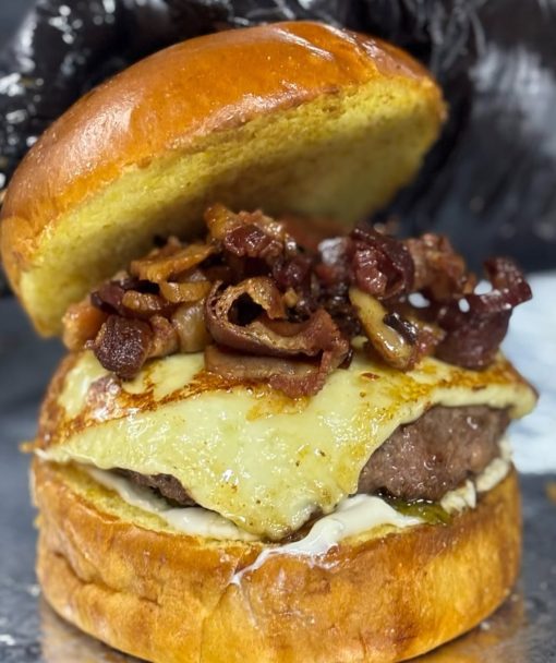 Burger artesanal de carne bovina, grelhado com suculência e sabor marcante