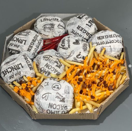 Batata frita crocante em boa quantidade, servida em volta dos lanches.
